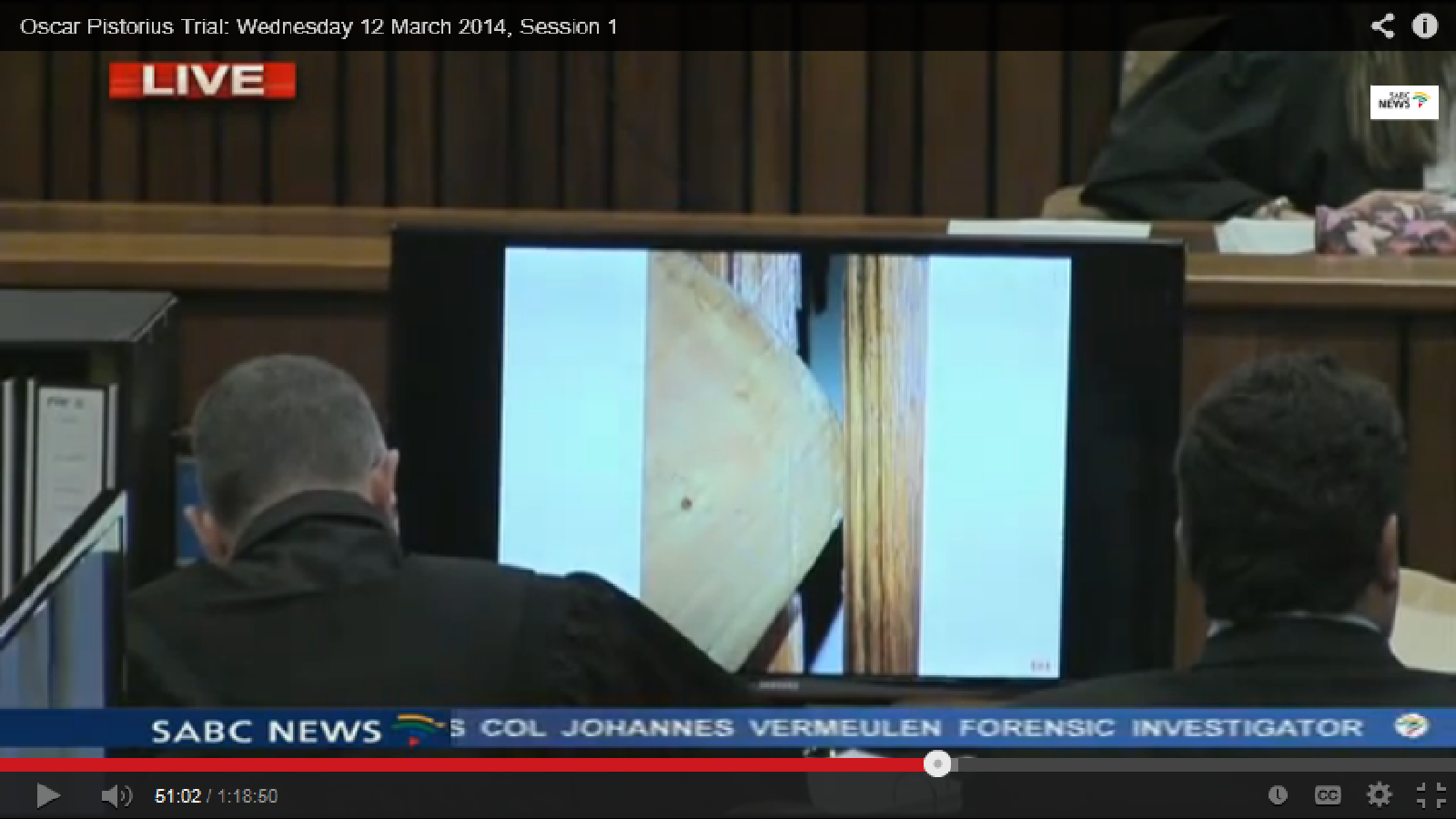 Vermeulen was sent to Oscar’s house to investigate on March 8, 2013, along with other experts. He was specifically requested to perform testing on the cricket bat and the toilet room door. He also was asked if he could ascertain the cause of the bending of the metal plate on the outside of the bathtub.