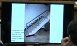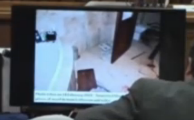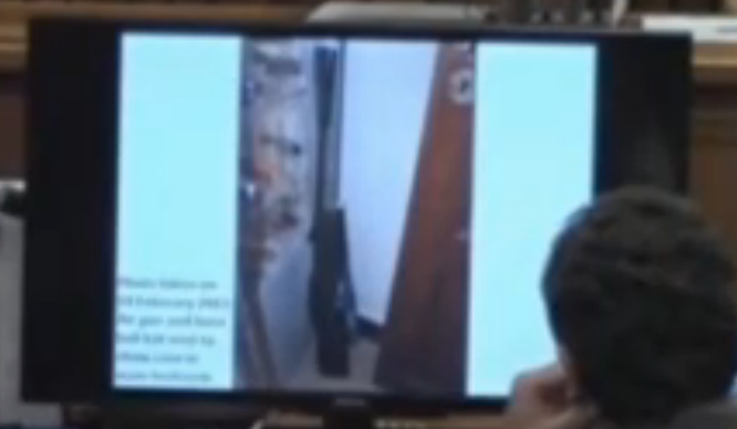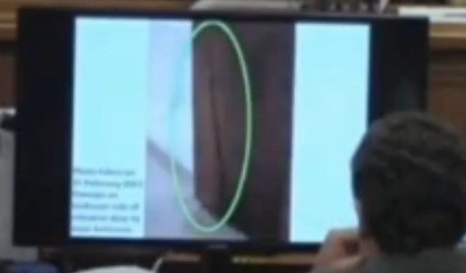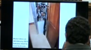 And again… here is a photo of the toilet room door reassembled in the courtroom that shows the 4 bullet holes and damage done by the cricket bat.