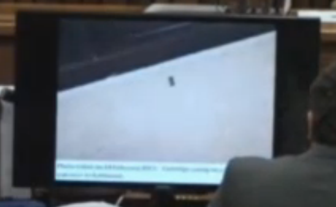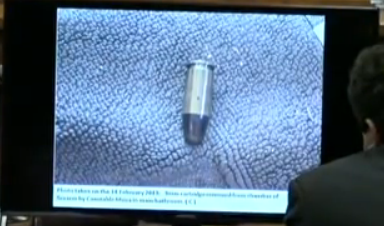 1. I found a pic in Day 11 that shows the cartridge near the cricket bat… now looking to see if I have a pic of the last cartridge as we speak. These are the notes I have from Mangena’s testimony regarding the location of the cases: As for the position of the cartridge cases, he was not able to tell exactly where Oscar was standing for each shot because the cartridge cases were so scattered at the scene. Based on the fact that there was a lot of movement in the bathroom after the shooting, they were likely kicked around.