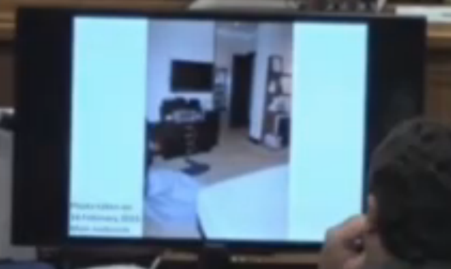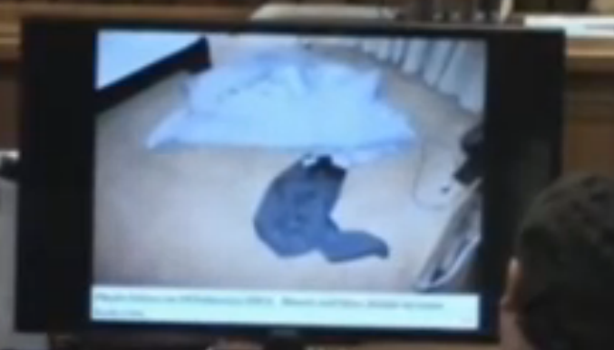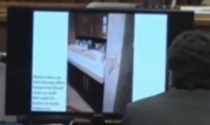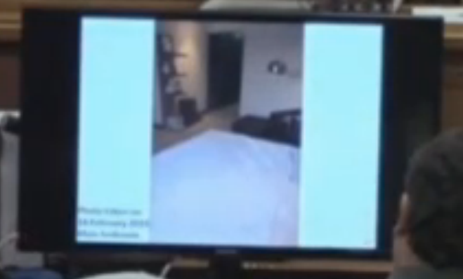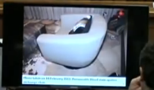 The following are the crime scene photos that were shown to the court. These photos are not released to the public, so the only way we can see them is on the video monitors at court. The quality is poor, and you will not be able to see a lot of the smaller blood spatter but you will get the jist of the layout and the scene as it was found.