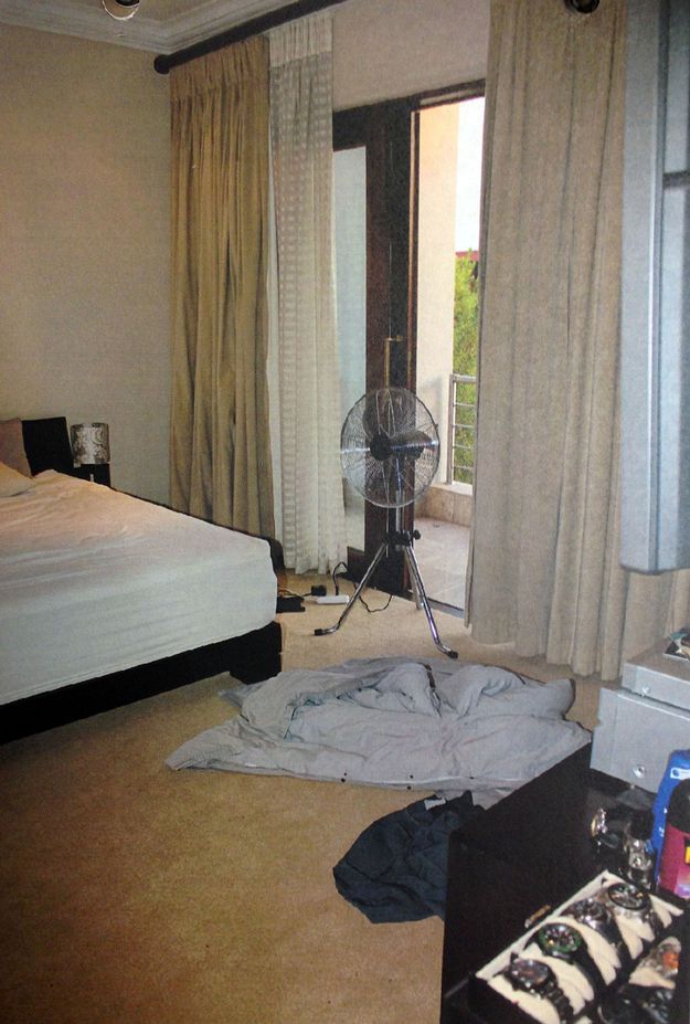 The right side of the bed and floor. You can also see the fan that Oscar states he had retrieved off the balcony, according to the bail application.