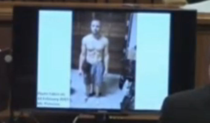 Oscar was kept outside in the garage, being guarded by police. A few photographs were taken in the garage that show large blood stains on the right side of his shorts and body. In this photo it initially appears as if he does not have prosthetics on but if you look closer he does. His left side was photographed as well. Oddly, he seems to be missing blood on his chest and shoulders. It almost looks like he was wearing a shirt and then took it off.