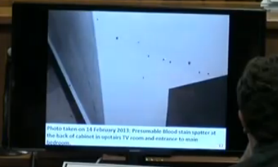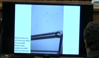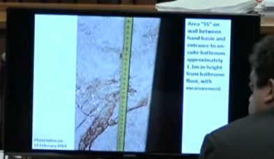 There was also blood spatter found on the bedroom wall behind the bed. It was located on the left hand side just slightly above the head rest. You can see a white circle added in the photo to indicate the location. Ironically, or not, this is the same area where the gun holster was found. Why is there blood spatter on the duvet and next to the bed on the wall? According to Oscar’s story, he pulled Reeva out of the toilet room and carried her from the bathroom, out the bedroom door and down the stairs. These blood spatters are in locations that are not in that path. This has yet to be explained by the State.