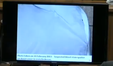 The duvet was found crumpled up on the floor in front of the bed when Van Staden began to photograph. He spotted a few drops of blood spatter on the duvet, which he took a photo of. He then spread out the duvet and found more droplets on the inside of the duvet.