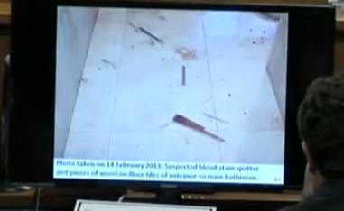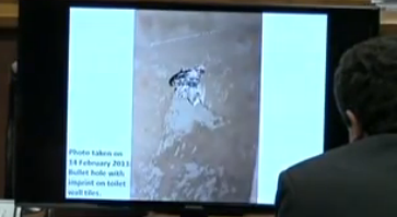 He next focused on the door and the toilet room, and the blood stains and bullet fragments found inside there. You can see two areas of the bathroom wall that were damaged by bullets. One by a direct hit (missed shot) and one caused by ricochet.