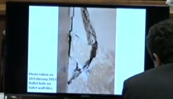 Mangena is back on the stand. He states his opinion is there were 4 shots fired at the crime scene. All 4 bullets perforated the door to the toilet room.