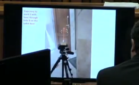 Out of the 4 shots, only 1 hit the wall directly and the other 3 disappeared, meaning they hit the person in the room. In order to determine the angle of the shots, Mangena used that 1 direct bullet mark to line up the appropriate hole on the door. The angle was determined to be 5-6% downward. Bullet hole B was in alignment with the hole marked E on the wall.