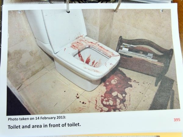 There were no foot or shoe marks found inside the toilet room. This is an interesting point. Oscar claims that he had put on his prosthetic legs before he broke down the door to pull Reeva out. How could there be no foot marks found? When I look back at the images of Oscar in his prosthetic legs, I see blood stains on the top of the socks but I do not see stains on the bottom of the socks (at least from the photos that we’ve seen).
