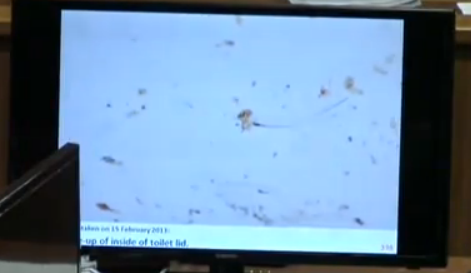 Next he discusses the findings in the toilet room. Based on the blood spatter on the toilet seat and the particulate of blood, tissue and broken hair on the lid of the toilet seat, he concludes that there was a significant event that occurred to the head in the immediate vicinity of the toilet, with the head coming in contact with the toilet.