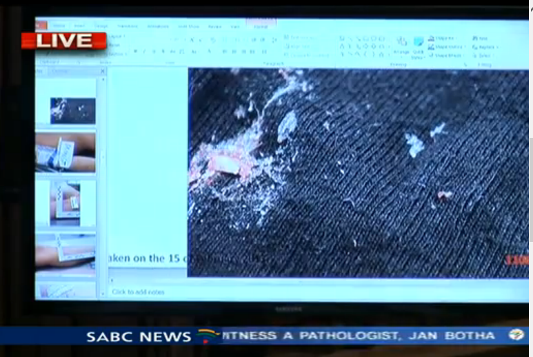 Roux also wants to mention that when Reeva fell on the magazine rack, itās possible that her shirt moved up at the time, which means that the shirt may not have been a possible cause for the striations. Plus, there were also holes in the back of the shirt. So he is trying to throw out the Defense assertion that the shirt could have caused that pattern.
