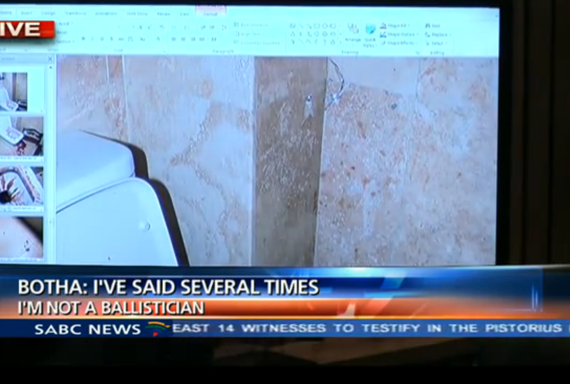 But Botha believes it happened while she was falling. Nel reminds him that they agreed that she was falling after the hip wound. So if sheās falling backwards and gets hit while falling, she is not right up against the door like they were trying to state earlier. Botha now tries to say that he believes she was in āreasonable proximityā to the door and Nel wants to know if the toilet would be considered reasonable proximity. Botha canāt say, and challenges the State to test because he doesnāt believe that anybody has. This makes Nel pause, and Mangena grin in the background. Mangena did test the door.