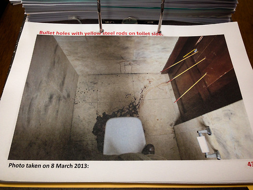 Interesting how OP says the he heard the wood noise and THEN he fired 4shots, when clearly you can see he fired 1shot at her standing close to the door, and then he fired directly at the magazine rack x3. Then he sort of muddies it a bit by saying the magazine rack was always placed to the right, trying to show that if he DID hear the magazine rack, well then he would have aimed towards the right. A magazine rack would be ideally within reach of one sitting on a toilet, you wouldn’t, want to have to get up off the toilet to reach a magazine, so it does not make sense that it would be placed to the right of the toilet wall. Thanks for putting up these photos. The more we see the clearer everything becomes.