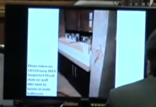 Nel then focuses on the duvet, jeans and carpet and points out where the blood spatter was found. It’s very hard to see on our TV monitors at home but he pointed it out and Oscar acknowledged. The white circles depict some of the areas where blood was seen. These are just some of the spots, not all of them.