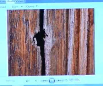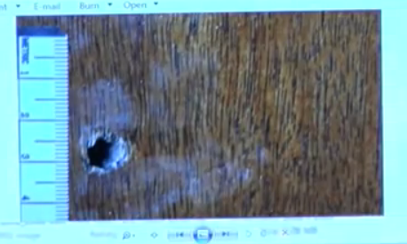The next photo is from their testing. They first put a crack in the door with the bat and then they fired a hole through it. He points out that this crack is continuous whereas the crack on the actual door is not.