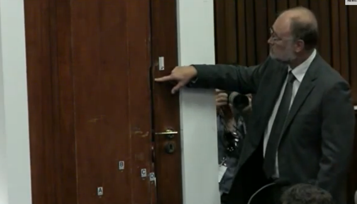 Dixon testifies that he has examined the bathroom door. He believes it was done on November 8, 2013. This examination was done at Oscar’s house and the door was reinstalled by the SAPS. Then on November 15th they went to the forensic laboratory in Silverton where in the presence of Vermeulen and Mangena, they examined the door again.