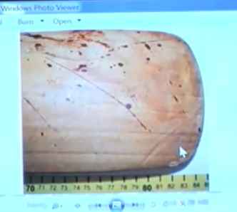 The next image shown is a close up of the top mark, the mark that the defense believes is the 3rd bat mark that Vermeulen didn’t identify as being caused by the bat. Dixon believes that this strike would not have been sufficient enough to break the panel in.