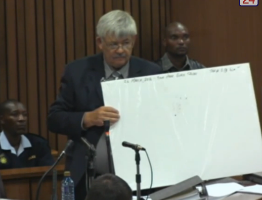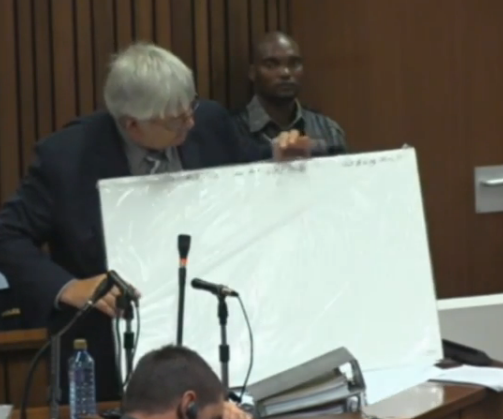 The third board was 30cm behind the door. Wollie points out that the boards say “Black Talon” at the top because at the time he was under the impression that was the bullet used, not the Rangers. Apparently in testimony which must have been missed by the feed earlier, he testified about Oscar using Ranger bullets, not Black Talons. Hopefully I can pick up more details about this in his testimony during Nel’s cross-examination.