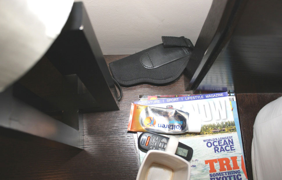 There is a tube of Voltaren gel on the closet side bedside table on top of the magazines in front of the gun holster. This pretty much tells me that Oscar was indeed sleeping on the closet side of the bed that night due to his sore shoulder. Also one photo of Oscar of his left profile after the shooting you can see the medical red tape is around his right shoulder blade on the right side of his back (quite a large area).