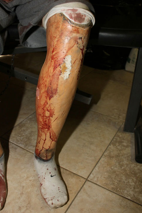 I agree with DJ that the metal plate was probably kicked in OP’s running amok. There’s a lot of damage to his legs.