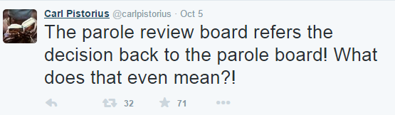 The parole review board decides to refer the matter back to the parole board. Oscar will remain in jail while he awaits that next hearing. It now looks likely he’ll remain in jail until The Appeal on November 3.
