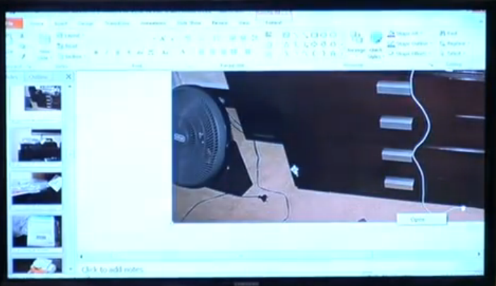 They then look at a photo of the upstairs hallway. In the photo you can see the brown linen cabinets (one half opened) and a blue towel lying on the floor in front of them. This is where Carice fetched the towels that morning.